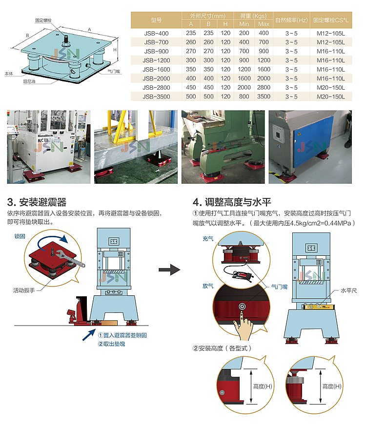 氣壓式防振裝置,配合油壓阻尼筒設(shè)計,適用于沖擊振動之消除,最高速沖床專用,低自然頻率值設(shè)計,防振效果佳。使用Neoprene Rubber材質(zhì),耐候性佳使用壽命長防油帽設(shè)計,具抗油性可防止一般油污腐蝕。內(nèi)部設(shè)計阻尼機構(gòu)可有效避免共振現(xiàn)象,自然頻率3Hz~5Hz,阻尼系數(shù)0.12~0.13,符合JISD-4101 氣墊耐壓試驗標準。